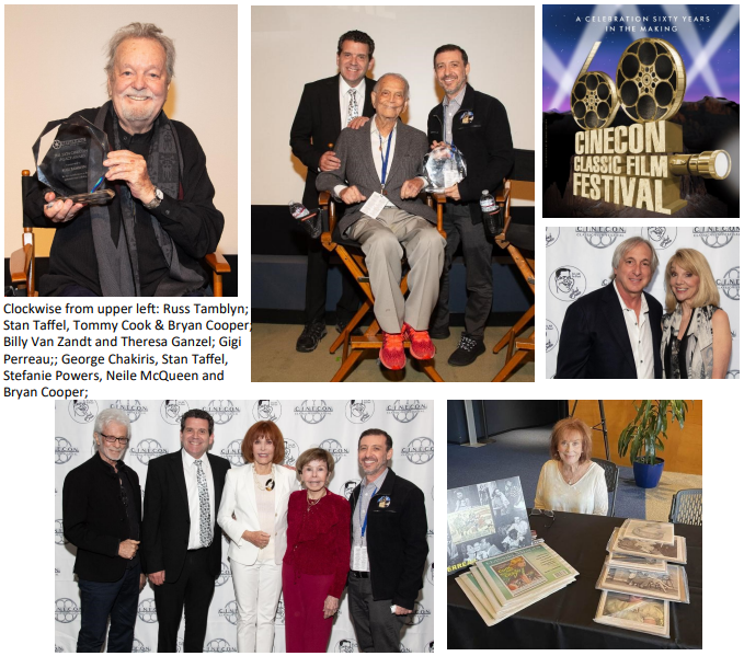 Cinecon 60 had another smash run this year at the Writers Guild Theatre in Beverly Hills. Legendary trio of Stefanie Powers, Russ Tamblyn and Tommy Cook were happily honored and presented awards by the legendary duo of George Chakiris and Neal Adams, widow of Steve McQueen. The opening night soiree was a big hit attended by Teresa Ganzel, husband Billy Van Zandt, prior honoree Patty McCormack with nephew Fred Cerullo plus film historian Alan Rode and wife Gemma. The late great casting director Marvin Paige’s name was on many attendee’s lips that night…. “This would have been the kind of party Marvin would love” reminisced many guests … Marvin’s close friend and former assistant Rachel Uher also attended. Thank you to Cinecon’s Brian Cooper and Stan Taffel for a great event with excellent food catered by Bacon Babe Catering owned by Jodi Taffel who is Stan’s sister.