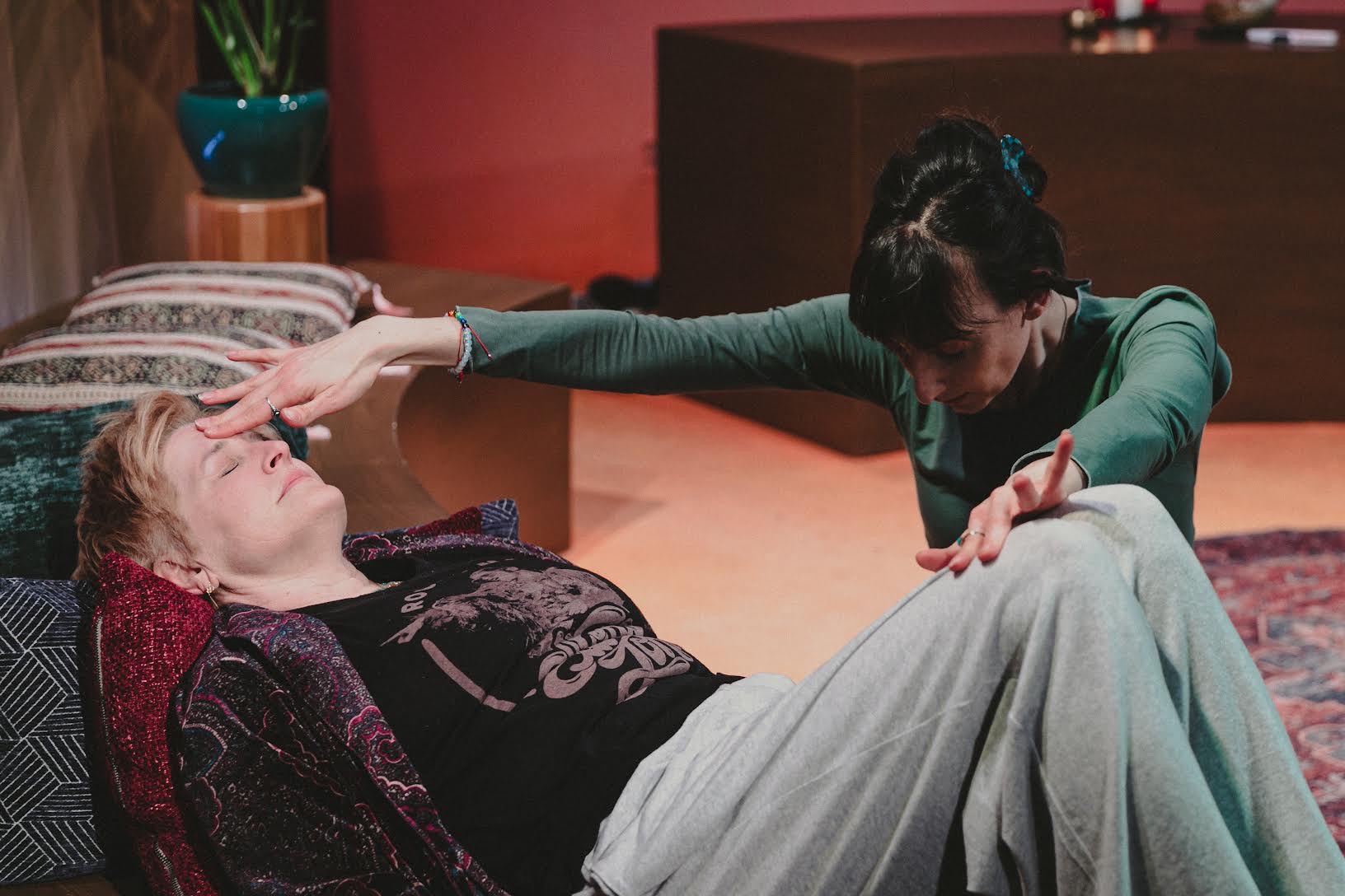 Maggie, with her light personality and healing capability, playfully at first but later with excitement and then with profound pain, sets an intention for Olivia to take another course of action and keep the baby. There is a moment when both women, different in generations, reach the culmination in riding on two different trains. The emotions and intentions were so powerful, both women became the pure, unforgettable burst of emotions, to the final stage of expression. I closed my eyes at times, to feel that open faucet of emotions through my closed eyes. By unifying the understanding what really needs to happen, with preconceived notion of inner peace, they make the transition to just do a ritual.