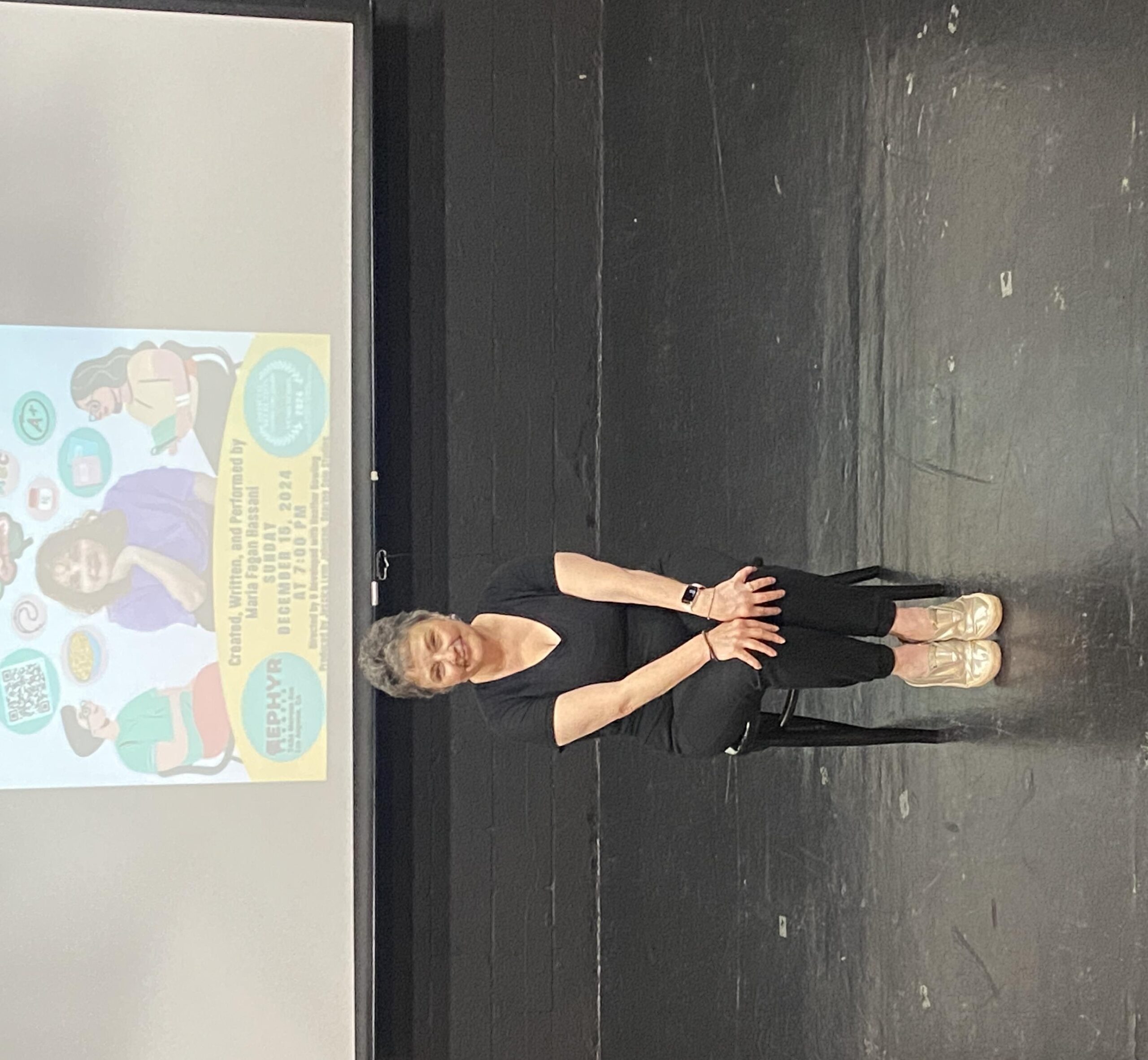 Produced by Jessica Lynn Johnson and directed by and developed with Heather Dowling, who is also a character coach.  Some of Maria’s characters stand out clearly and by having three chairs on the stage and a projection on the screen behind her helped the audience to see different environments, to see the characters. Jessica Lynn Johnson and Heather Dowling create a lot, and they work like a charm together.