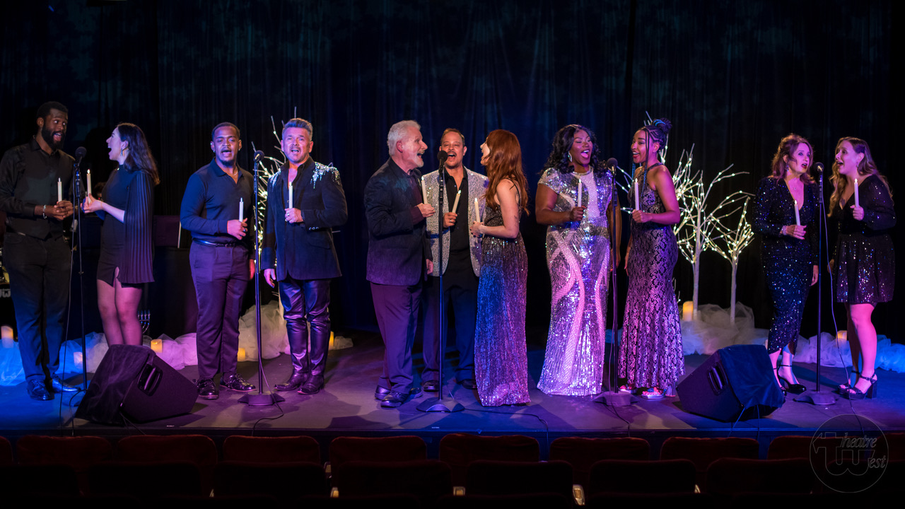 The five-piece band, led by James Lent, fired up and off we went into an excursion of Broadway, pop and classic Christmas songs. A modest stage of black and Christmas white lights was soon filled with eleven singers who led us into the season with pieces arranged mostly by Victoria Lavan who also was part of the ensemble. The current moderator of Theater West’s musical theater unit, Lavan cleverly interspersed the performances with spot-on quotes and poetry from Longfellow to Leonard Cohen.