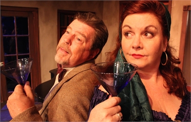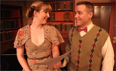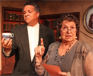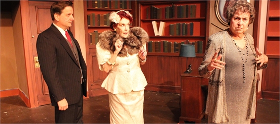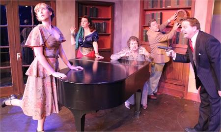 The Musical Comedy Murders of 1940 is good old fashioned silly escapist fun and the colorful performers are excellent and very well cast. The intriguing behind the scenes show business plot revolves around a backer’s audition for a Broadway musical called “White House Merry-Go-Round” in an upstate New York mansion (nice set and lighting by Pettifogger and Yancey Dunham respectively) owned by wealthy theatre patron Elsa Von Grossenkneuten filled with eccentric quirky theatrical types, murder, passion and dark secret passage ways. The characters become trapped by a snowstorm, phone lines and electricity are cut and the bodies soon begin to pile up as the mysterious Stage Door Slasher and another homicidal lunatic begin to terrorize the group.